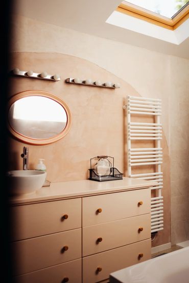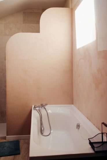 La salle de bain se compose d’un meuble avec vasque, d’une baignoire idéale pour les enfants ou pour un moment de détente, ainsi que d’une douche pratique et fonctionnelle. Un espace pensé pour le confort de toute la famille.