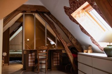 Concernant l'étage vous avez la première chambre avec un lit de 180/200 et un lit une place de 90/190. La deuxième zone est un espace prisé par les enfants.. on y trouve un espace lecture un espace bureau et un espace couchette de 140/190cm.